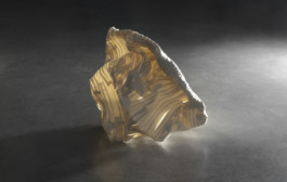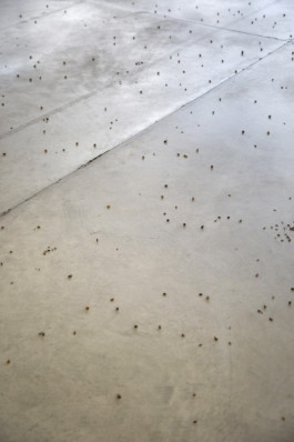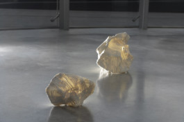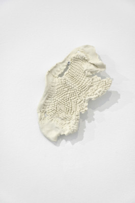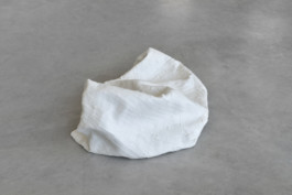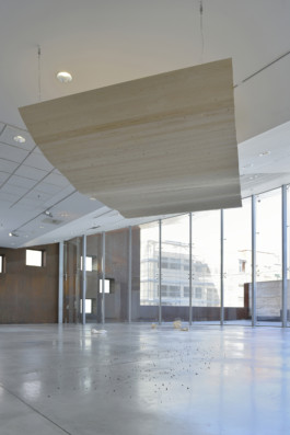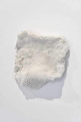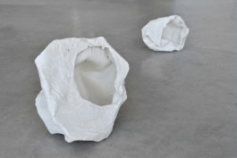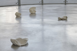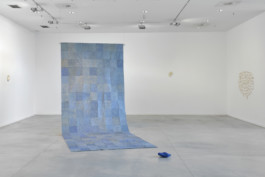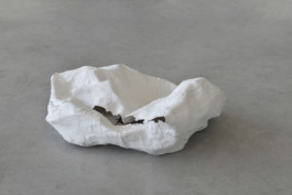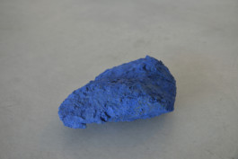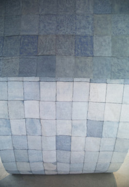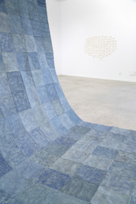 Há no meu trabalho um processo de dissecação, de descoberta dos objectos, dos materiais, das matérias em todas as suas camadas até as conseguir ver por dentro. Para o trabalho “Desgastar em Pedra (segundo ensaio), pedi a várias pessoas que me ajudassem a retirar a areia de dezenas de lixas azuis Bosch. Com ela moldei uma pedra e com o que restou cosi uma espécie de manta. Falo do material e das suas especificidades com ele mesmo. Neste caso, a lixa abre-se em dois para voltar a ser a sua origem: tecido e areia. Há neste percurso entre o industrial (lixa) e o orgânico (obra) um processo lento, humano, próximo ao do artesanato. Os vestígios de areia no manto azul são marcas de cansaço, de ritmos e temperamentos diferentes.