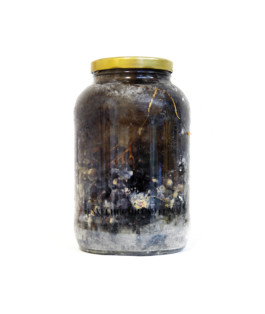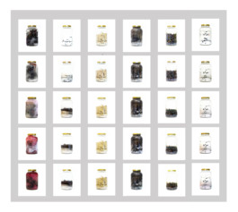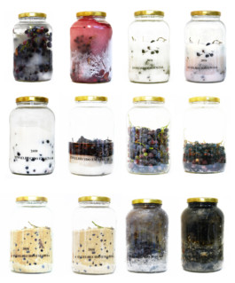 Registo do processo de envelhecimento de uvas em materiais tradicionalmente utilizados para conservar: sol, sal, gelo, açúcar, areia, e fumo, (5 meses)