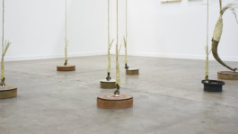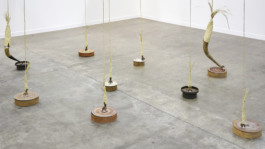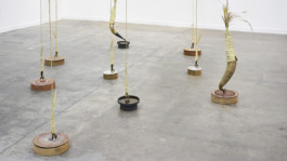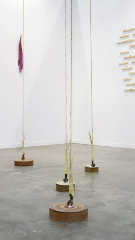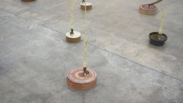 Garras de animais com uma bola de cristal e cornos esculpidos em forma de pássaros e peixes são suspensos por atrapanovios de palma - produzidos especialmente para as dimensões dos objetos (peça de artesanato mexicano usado como jogo lúdico, para prender e segurar pessoas pelos dedos). As garras com a bola de cristal são bases das pernas de bancos antigos de pianistas (usados sobretudo no México e Estados Unidos). Os cornos, ainda que talhados como pássaros ou peixes, têm uma relação imediata com o som da corneta (berrante) feita com o mesmo material. Debaixo destes objetos, com a ajuda de um mecanismo simples a pilha (tapados pela lixa ou pelo prato de cerâmica) giram lixas ou bases cerâmicas com água de diferentes diâmetros. As lixas, gastas em diferentes carpintarias, têm os restos de vários tipos de madeira (diferentes cores). Os restos de madeira e a areia da própria lixa, em fricção com o cristal das bolas de cristal, produz um som baixo (pode ser amplificado ou não). Em toda a instalação há uma promessa de som de um instrumento possível. Pressente-se o som sem que seja necessário ouvi-lo. A água em movimento, junto com as bolas de vidro, alude para o som produzido pelos dedos molhados em copos de vidro, mas também para as vasijas silbadoras (instrumentos de barro muito usados na América Latina que tocam a partir da água e passagem de ar).
