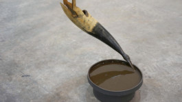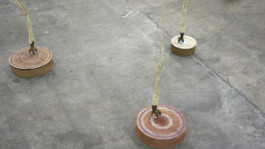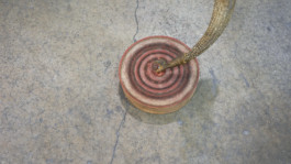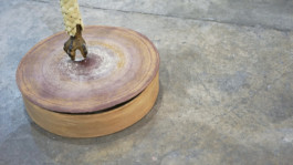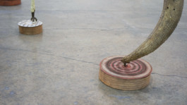 The horns, even though they were carved like birds or fish, they have an immediate connection to the sound of the (loud) horn made from the same material. Under these objects, with the help of a simple battery mechanism (covered by sandpaper or a ceramic plate) a sandpaper or ceramic bases rotates in different diameters. The sandpaper used in different carpentry shops has the remains of different types of wood (different colors). The wood, together with the sand from the sandpaper itself, in friction with the crystal of the balls produces a low sound (that can be amplified or not). However, throughout the installation there is a promise of sound from a possible instrument. You can feel the sound without having to hear it. The moving water, together with the glass balls, alludes to the sound produced by wet fingers in glass cups, but also to the "vasijas silbadoras"(clay instruments widely used in Latin America that play from the water and the passage of air).
