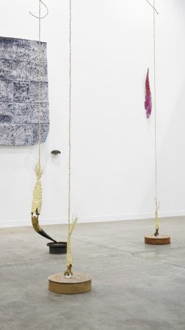 Atrapanovios (traditional Mexican handcrafted palm), worned sandpaper sheets from Portuguese and Brazilian carpentries workshops, rotation mechanism, wooden base, animal claw with crystal ball (used as a base in old pianist stool). Black sandstone, water, animal horns carved like birds and fish.