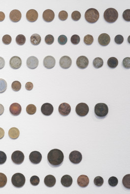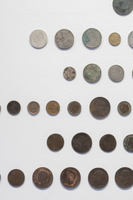 The coins, coming from different countries, are separated and ordered according to the figures that are engraved in them: men who look right, men who look left; women who look right, women who look left; statues facing right, statues facing left. Each line of coins (visible in the images) corresponds to the same figure, there is to say, to the same coin, ordered by how worn out they are: in the centre, the most defined figure and in the line’s extremity, the practically faded figure.