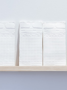 12 positives made with porcelain removed from old stamps with biweekly calendars (used to print employee time tracking record)